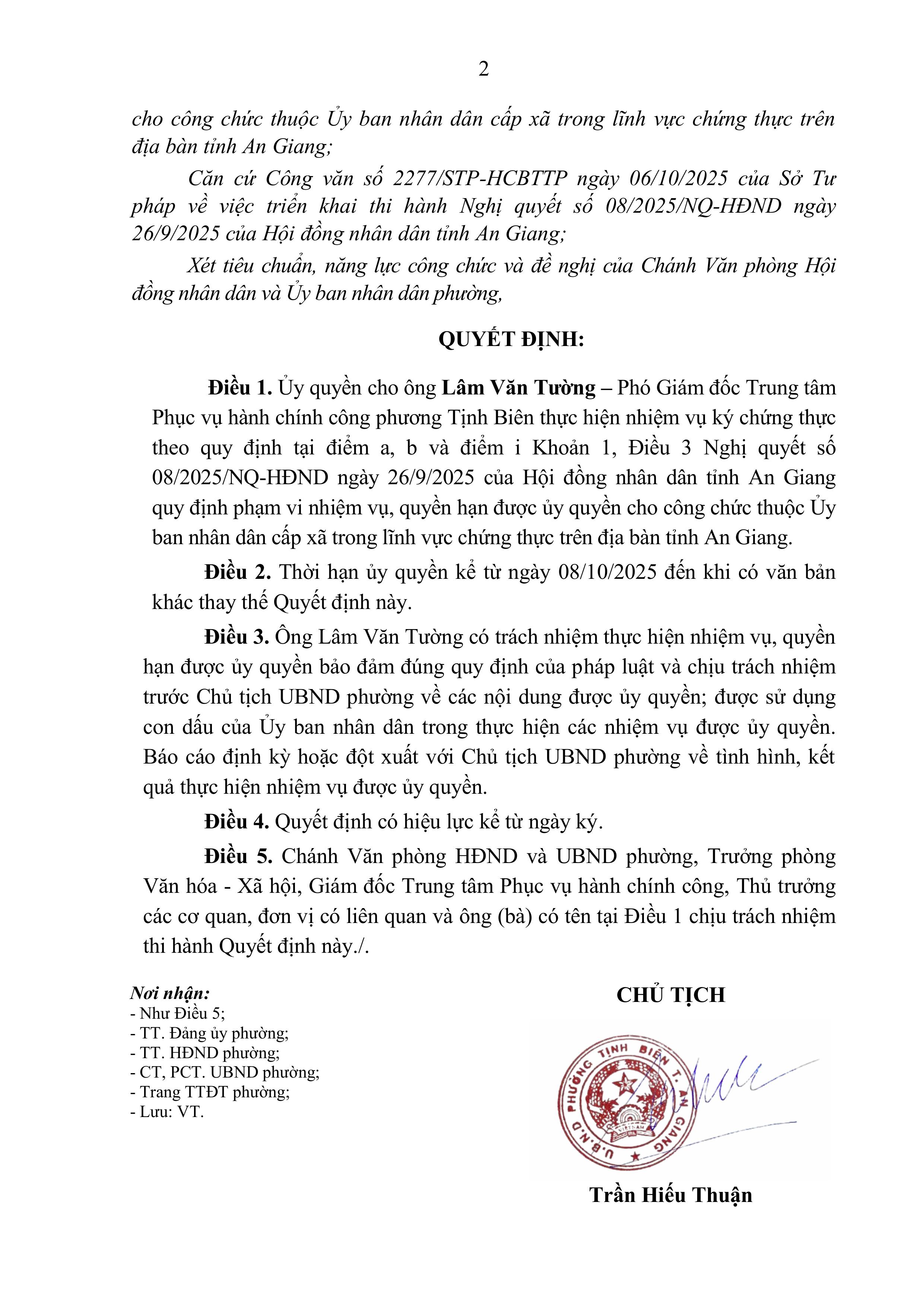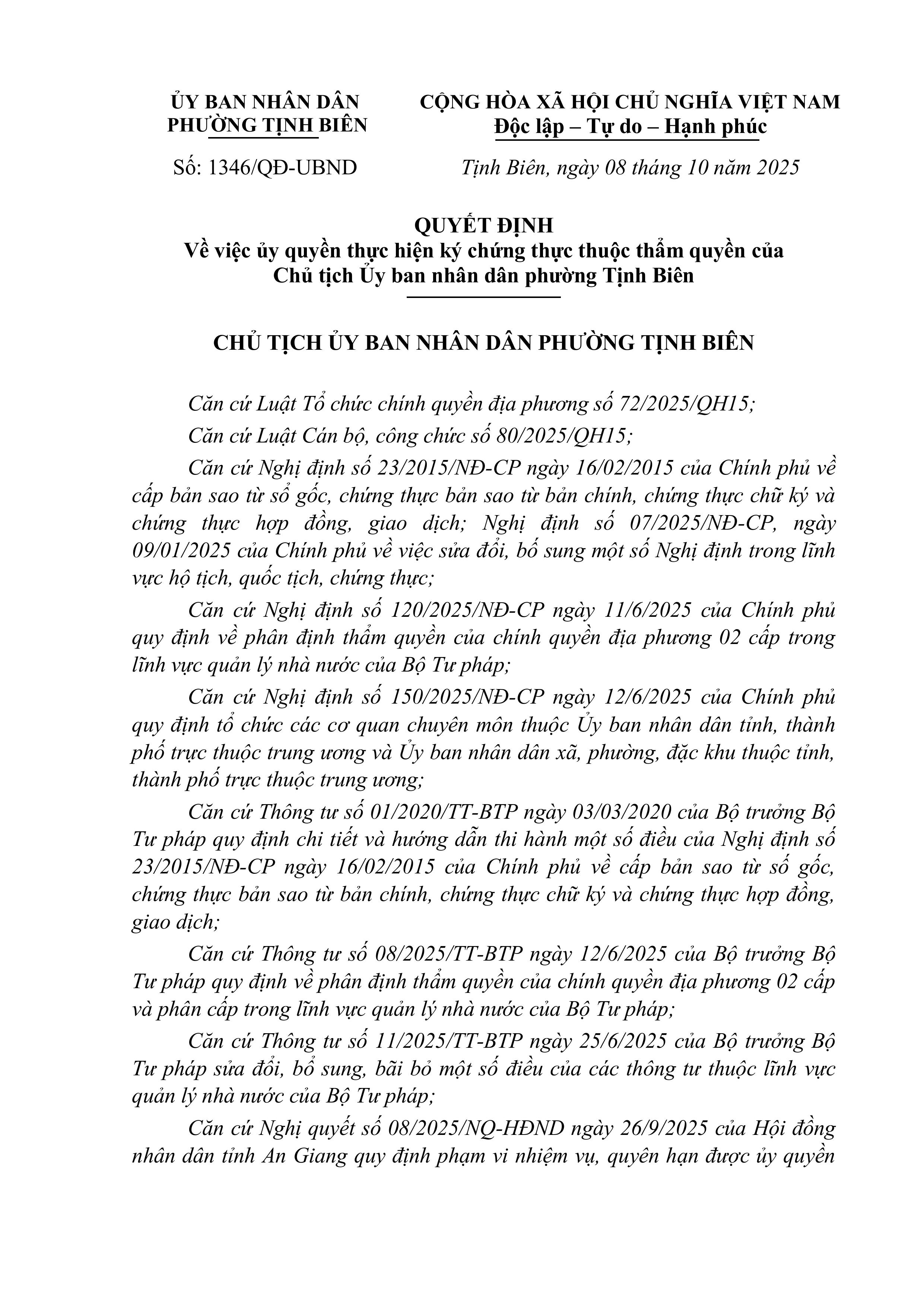 Quyết định về việc ủy quyền thực hiện ký chứng thực thuộc thẩm quyền của Chủ tịch Ủy ban nhân dân phường Tịnh Biên